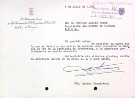 Carta d'agraïment del governador civil de Tarragona al president del Centre de Lectura