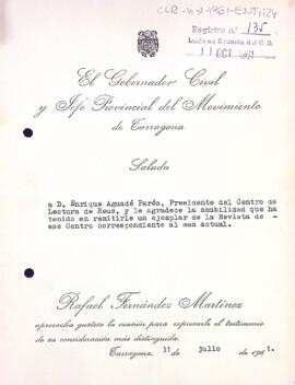 Carta d'agraïment del governador civil de Tarragona al president del Centre de Lectura