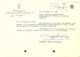 Rafael Fernández agraeix a Enric Aguadé el telegrama rebut pel seu nou nomenament com a governador civil de la província de Tarragona.