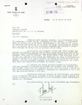 F. Masó Majó informa Enric Aguadé que el Liceu ha decidit retre homenatge a la ballarina Roseta Mauri amb una representació del repertori més habitual, en el qual hi poden assistir els socis interessats. Ajunta llistat de preus de les diferents localitats.