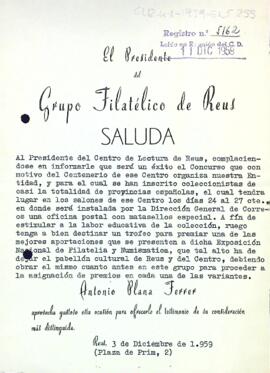 Antonio Plana Ferrer, president del grup filatèlic, demana la col·laboració del Centre de Lectura amb el donatiu d'un trofeu que s'entregarà a les millor aportació de l'Exposició Nacional de Filatèlia i Numismàtica.