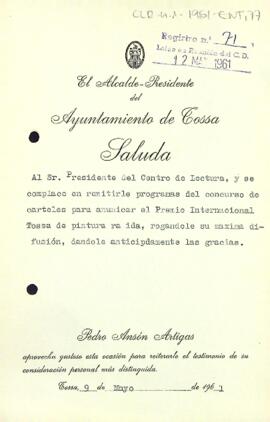 Carta del l'alcalde de Tossa al president del Centre de Lectura