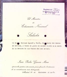 Jesús Rubio García-Mina, ministre d'Educación Nacional, agraeix l'obsequi d'un exemplar de la Revista del Centre de Lectura. Data del document: 16-12-1957