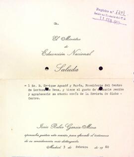 Jesús Rubio García-Mina, ministre d'Educació Nacional, agraeix a Enric Aguadé Parésl'obsequi d'un exemplar de la Revista del Centre de Lectura. Data del document: 03-02-1960