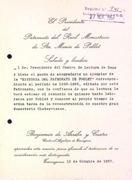 Benjamín de Arriba y Castro, president del Patronato del Real Monasterio de Sta. María de Poblet, obsequia al Centre de Lectura amb un exemplar de l'obra "Historia del Patronato de Poblet". Data del document: 10-10-1957