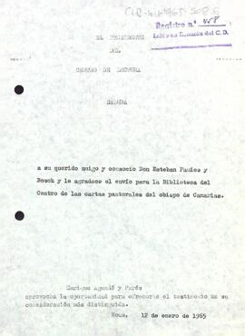 Enric Aguadé agraeix a Esteban Pàmies el donatiu d'unes cartes pastorals del bisbe de Canàries.