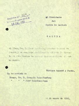 Enric Aguadé comunica a Juan Aparicio el donatiu d'un exemplar del darrer número de la Revista del Centre.
