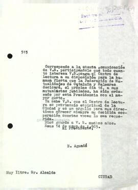 Enric Aguadé comunica a Joan-Amado Albouy que posa el Centre de Lectura a disposició de la ciutat per a poder celebrar la festa de la Federació de Mutualitats.