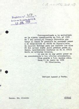Enric Aguadé comunica a Joan Bertran que el Centre els cedeix el Saló d'Exposicions per instal·lar el XVIII Saló d'Artistes Locals.