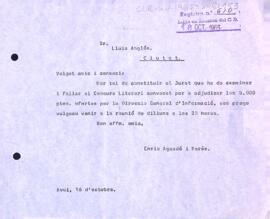 Enric Aguadé convoca Lluís Anglès a la reunió per a constituir el jurat del Concurs Literari.