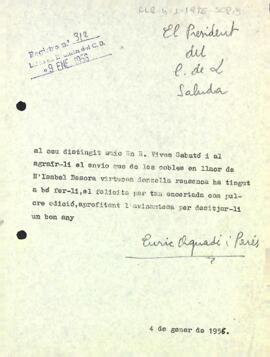 Enric Aguadé agraeix a Ricard Vives el donatiu de cobres a llaor d'Isabel Besora.