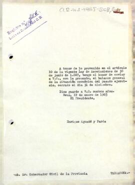 Enric Aguadé comunica a Rafael Fernández l'enviament del balanç general de la situació econòmica de l'entitat del passat exercici.
