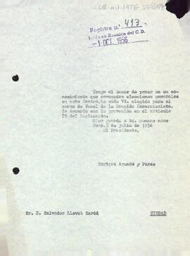 Enric Aguadé informa Salvador Llevat Sardà que en les últimes eleccions generals ha estat reelegit per ocupar el càrrec de vocal de la Secció Excursionista.