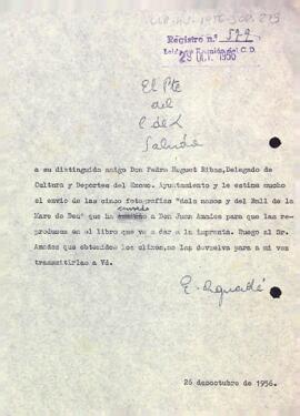 Enric Aguadé agraeix a Pere Huguet, delegat de cultura i esports de l'Ajuntament de Reus, el donatiu de cinc fotografies dels nans i del ball de la Mare de Déu, entregades a Joan Amades, les qual seran usades per a l'edició d'un llibre.