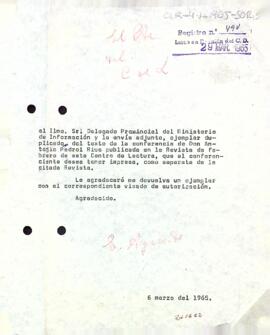 Enric Aguadé comunica al delegat l'enviament de dos exemplars del text de la conferència d'Antoni Pedrol Rius publicat a la Revista del Centre de Lectura.