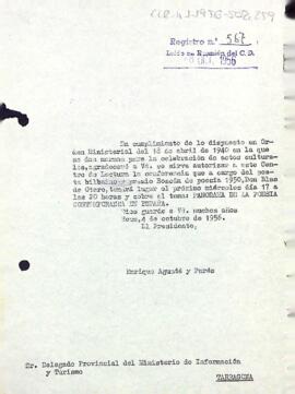 Enric Aguadé sol·licita el permís necessari per poder celebrar la conferència de Blas de Otero.