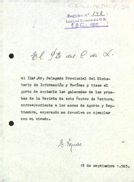 Enric Aguadé comunica al delegat l'enviament de les galerades de les proves de la Revista del Centre dels mesos d'agost i setembre.