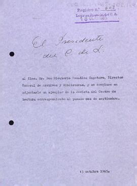 Enric Aguadé comunica a Eleuterio González el donatiu d'un exemplar de la Revista del Centre de Lectura.