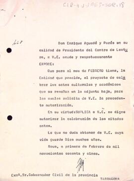 Entic Aguadé sol·licita a Rafael Martínez l'autorització necessària per poder celebrar els actes culturals i acadèmics anotats.