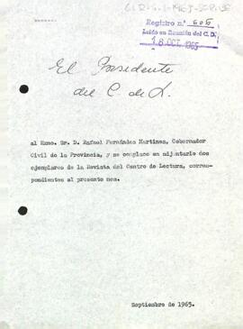 Enric Aguadé comunica a Rafael Fernández l'enviament de dos exemplar de la Revista del Centre de Lectura.