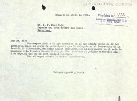 Enric Aguadé comuncia a F. Masó que el secretari de la Secció de Literatura, Jaume Aguadé, és la persona elegida que per representar el Centre de Lectura en l'homenatge que es farà a Roseta Mauri.