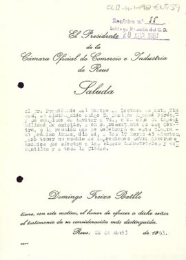 Invitació del president de la Cambra Oficial de Comerç de Reus al president demanant que convoqui una reunió amb la gent que cregui necessària per començar el projecte d'una Escola de Belles Arts