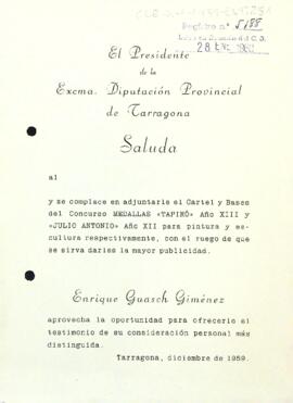 Enric Guasch informa Enric Aguadé de l'adjunció del cartell i les bases del Concurs Medallas "Tapiró" any XIII, de pintura, i "Julio Antonio" any XII de cultura.