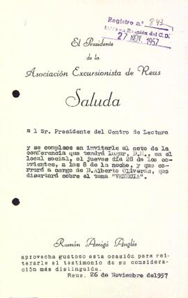Ramon Amigó Anglès, president de l'Associació Excursionista de Reus, convida al president del Centre de Lectura a la conbferència d'Alberto Oliveras, "Venecia". Data del document: 26-11-1957