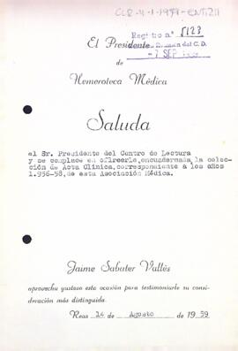 Carta del president de l'Hemeroteca Mèdica al Centre de Lectura