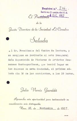 Juli Vernis Gavaldà, president d'El Círcol, convida al president del Centre de Lectura a la inauguració de l'Exposició de pintures d'artistes reusencs contemporanis. Data del document: 28-11-1957