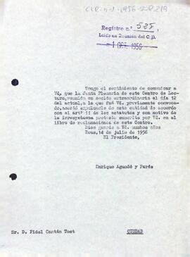 Enric Aguadé comunica a Fidel Cantán Toset la decisió presa per la junta de plenària d'expulsar-la com a soci de l'entitat davant fets succeïts.