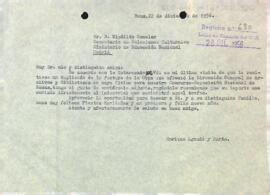 Enric Aguadé comunica a Hipólito Escolar Sobrino, secretari de relacions culturals del Ministeri d'educació nacional l'enviament del duplicat de la factura de la copa que es va oferir a la direcció general d'arxius i biblioteques durant el concurs-exposició nacional de Roses.