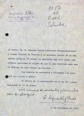 Item SOR, 324 - Carta del president del Centre de Lectura a Jacques Juillet