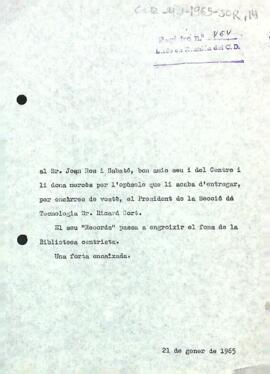 Carta del president del Centre de Lectura a Joan Ros i Sabaté