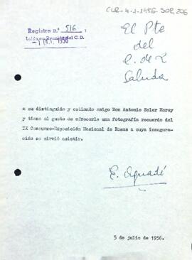 Enric Aguadé comunica a Antoni Soler Morey l'enviament d'una fotografia com a record del IX Concurs-Exposició Nacional de Roses.