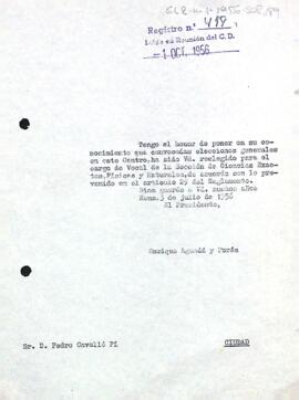 Enric Aguadé informa Pere Cavallé Pi que en les últimes eleccions generals ha estat reelegit per ocupar el càrrec de vocal de la Secció de Literatura.