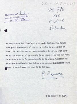 Carta del president del Centre de Lectura al Círculo Artístico de Tortosa