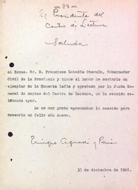 Carta del president del Centre de Lectura a Francisco Labadíe Otermín, Governador Civil de la província, enviant-li un exemplar de la memòria llegida i aprovada per la Junta General de Socis. Data del document: 31-12-1948
