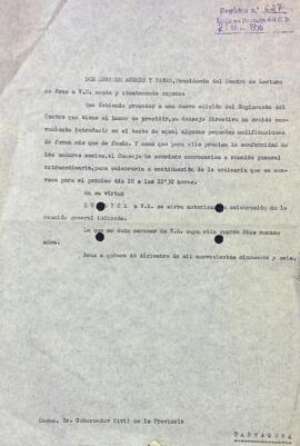 Enric Aguadé sol·licita al governador l'autorització necessària per celebrar una reunió general a la qual es vol convocar als socis per parlar del nou reglament de l'entitat.