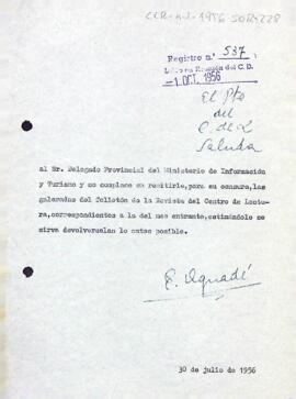 Enric Aguadé informa de l'enviament de les galerades del fulletó de la Revista del Centre de Lectura per a la seva censura.