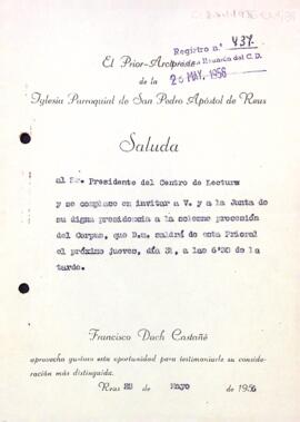 Invitació del prior de l'Església Parroquial de Sant Pere al Centre de Lectura