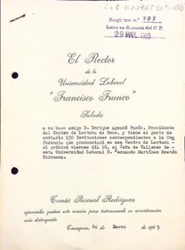 Carta del rector de la Universitat laboral Francisco Franco de Tarragona al president del Centre de Lectura