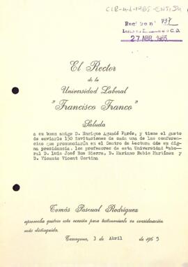 Carta del rector de la Universitat laboral Francisco Franco de Tarragona al president del Centre de Lectura