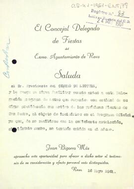 Carta del regidor de festes de l'Ajuntament de Reus al president del Centre de Lectura