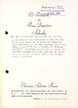 Antoni Sabater Roca, president del Reus Deportiu, convida al president del Centre de Lectura al Recital de Cant del 5 de desembre. Data del document: 02-12-1957