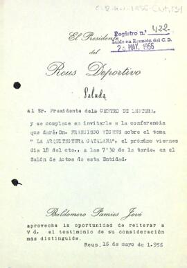 Unidad documental simple ENT, 131 - Invitació del Reus Deportiu al president del Centre de Lectura