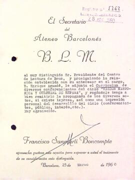 Francesc Sanmartí Boncompte, secretari de l'Ateneu Barcelonès, adjunta els curriculums vitae dels conferenciants del cicle "Visión histórica y cultural de España". Data del document: 23-03-1960