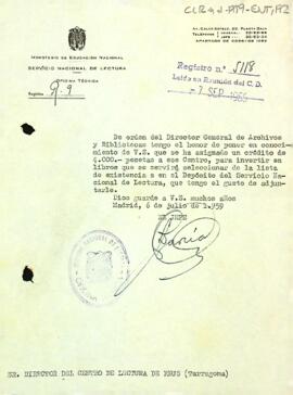El cap del servei nacional de Lectura informa Enric Aguadé que el director general d'arxius i biblioteques ha concedit al Centre de Lectura un crèdit de 4.000 pessetes per invertir en llibres.