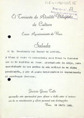 Carta del tinent alcalde de l'ajuntament de Reus al president del Centre de Lectura