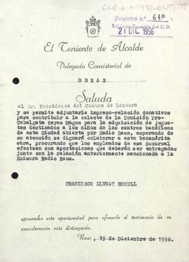 Francesc Llevat sol·licita a Enric Aguadé la seva col·laboració amb la Comissió pro-cavalcada la qual adquireix joguines per als nens de centres benèfics.